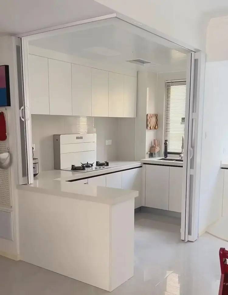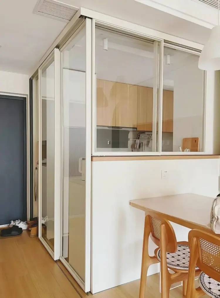 半开放式厨房:解决“油烟”与“互动”的两难,小户型也能“敞亮做饭”传统的中厨要么全封闭(压抑且缺乏交流),要么全开放(油烟大且无法通过燃气验收),年轻人通过“半开放设计”巧妙地打破了这一困境:吧台与隐藏玻璃门的组合,既能防止油烟又能与家人互动。