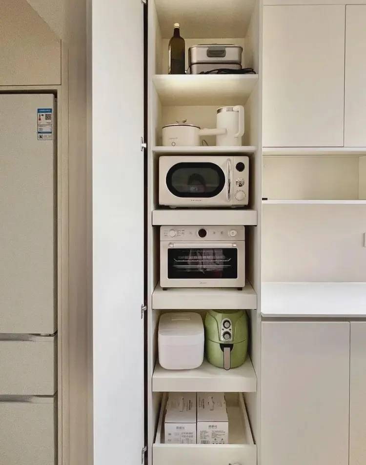 具体该如何操作?有三个妙招:其一,地柜采用多层抽屉设计——上层放置筷子刀叉,中层摆放碗碟,底层收纳锅具,拉开抽屉一目了然,无需弯腰翻找;其二,在炉灶旁安装实木隔板——将油盐酱醋放置其上,拿取比吊柜更为便捷,同时配备挂钩、洞洞板用于悬挂锅铲和清洁布;其三,小厨房安装高柜——内嵌烤箱和微波炉,隔层抽屉收纳不常用餐具,避免落灰。担心油烟问题?配备集成灶即可。