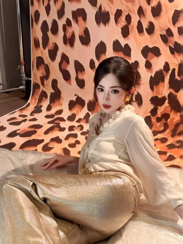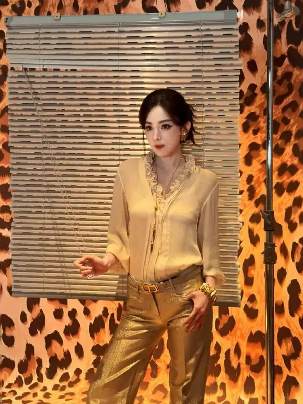 4月22日,一组古力娜扎拍摄的最新造型花絮照释出,图片中的她身穿蕾丝领上衣搭配金色长裤,优雅迷人。
